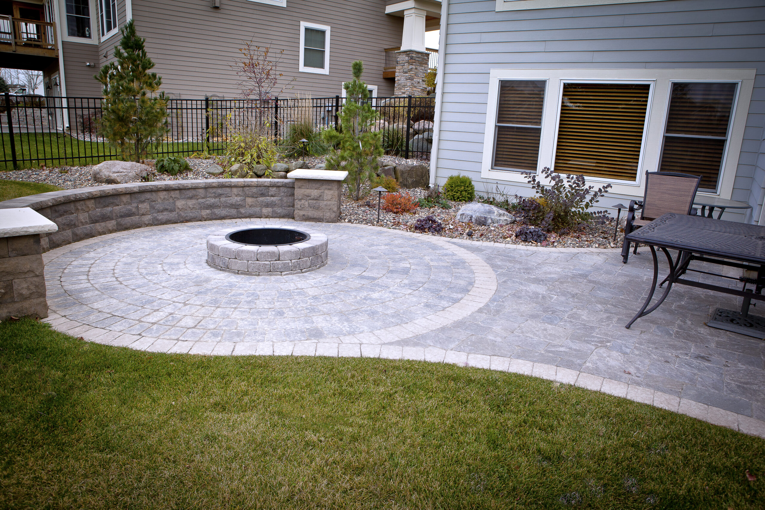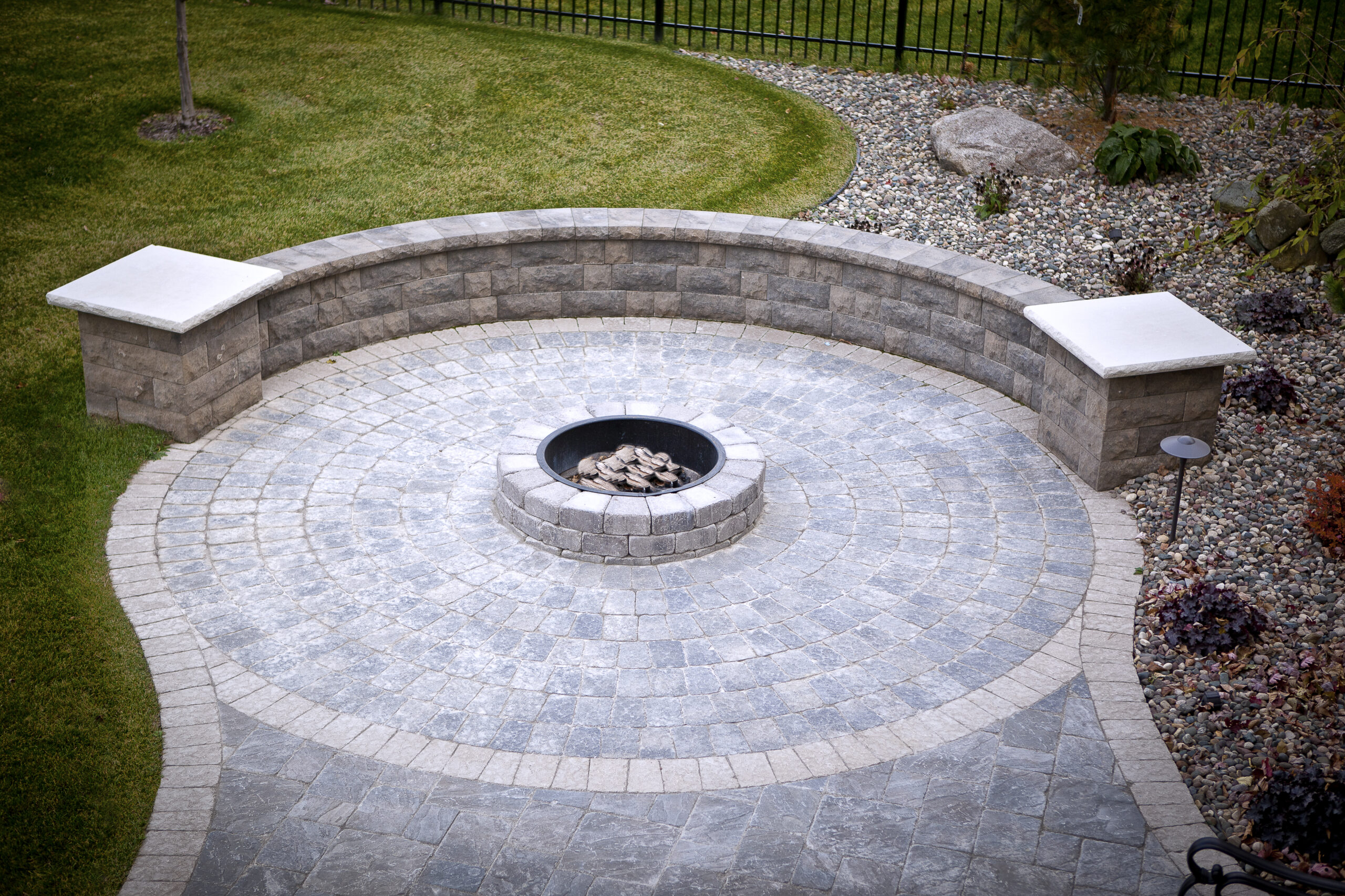 Project Overview: The customer was looking to add a paver patio with a firepit as well as seating. We installed the new paver patio with the firepit tying it to the existing paver patio. The knee wall with pillars was installed to integrate seating into the paver patio with the firepit.