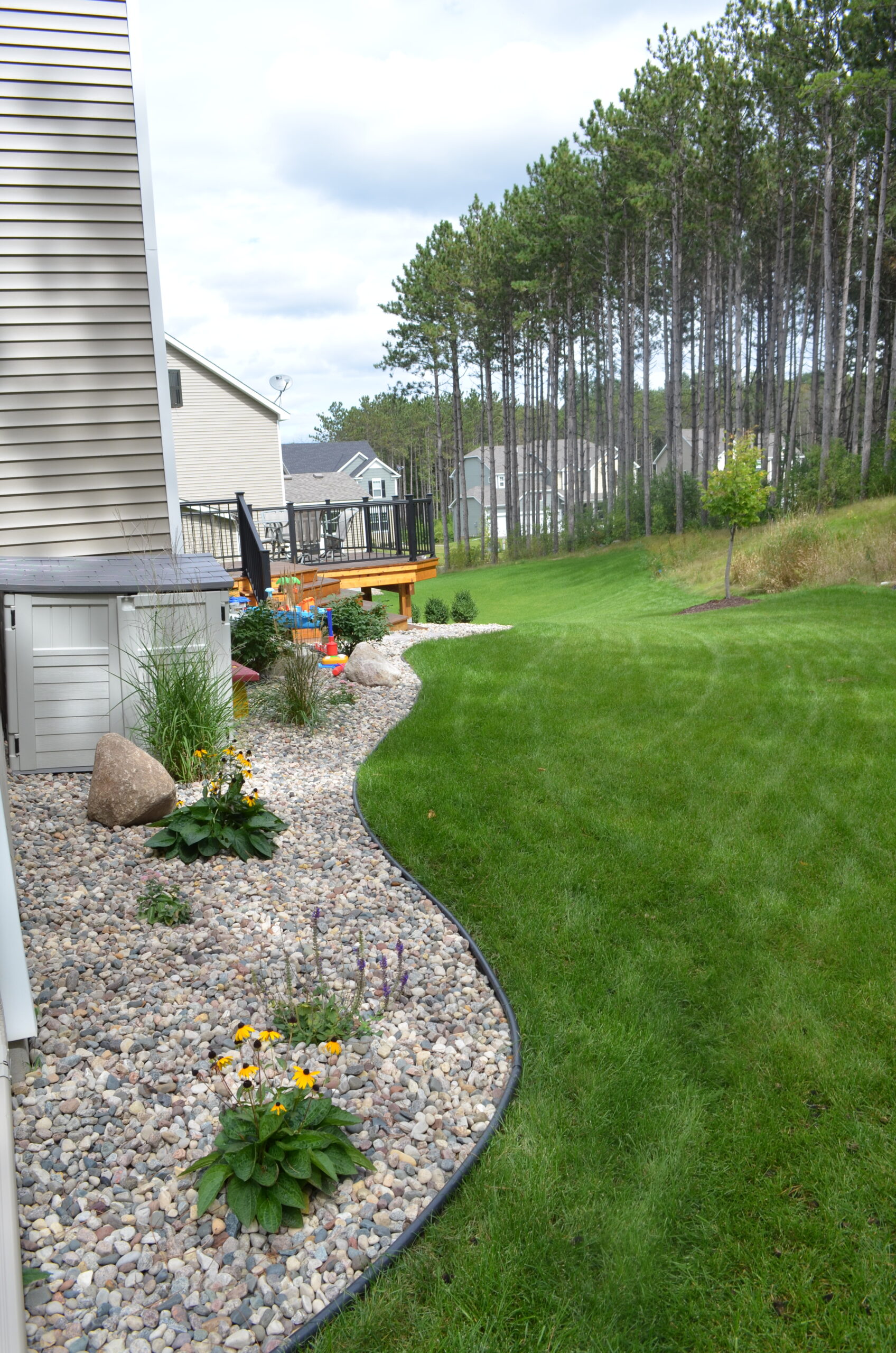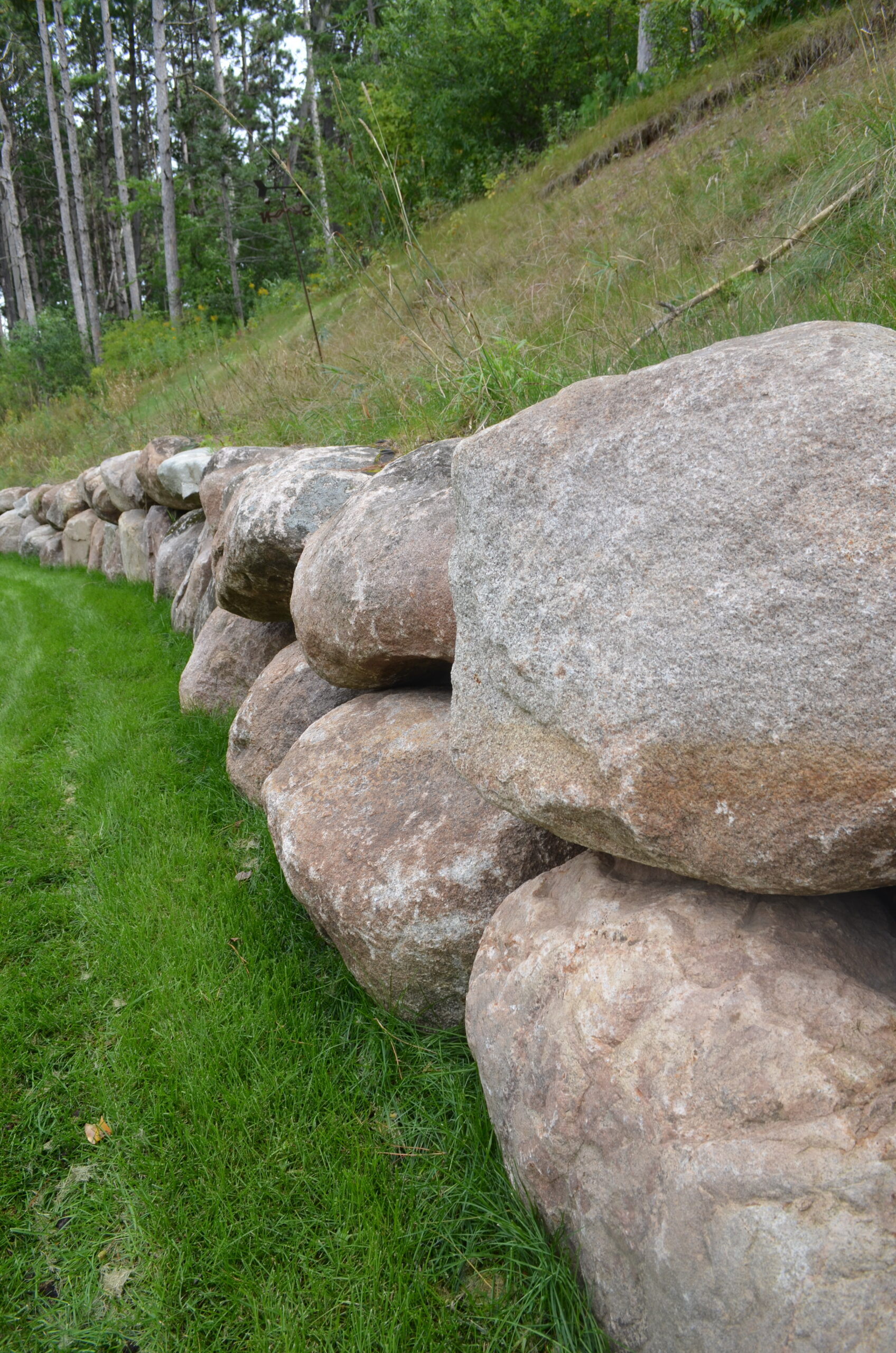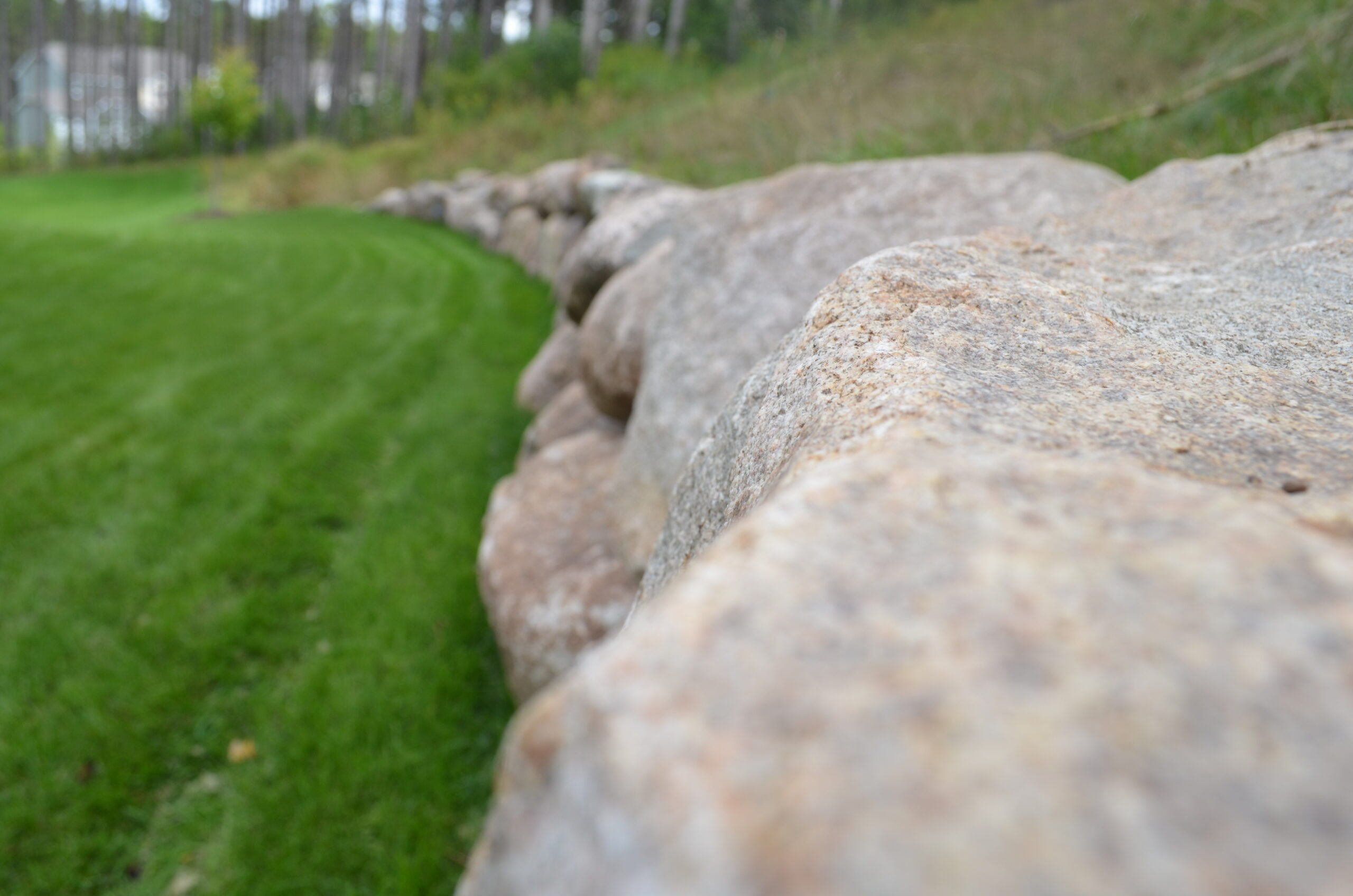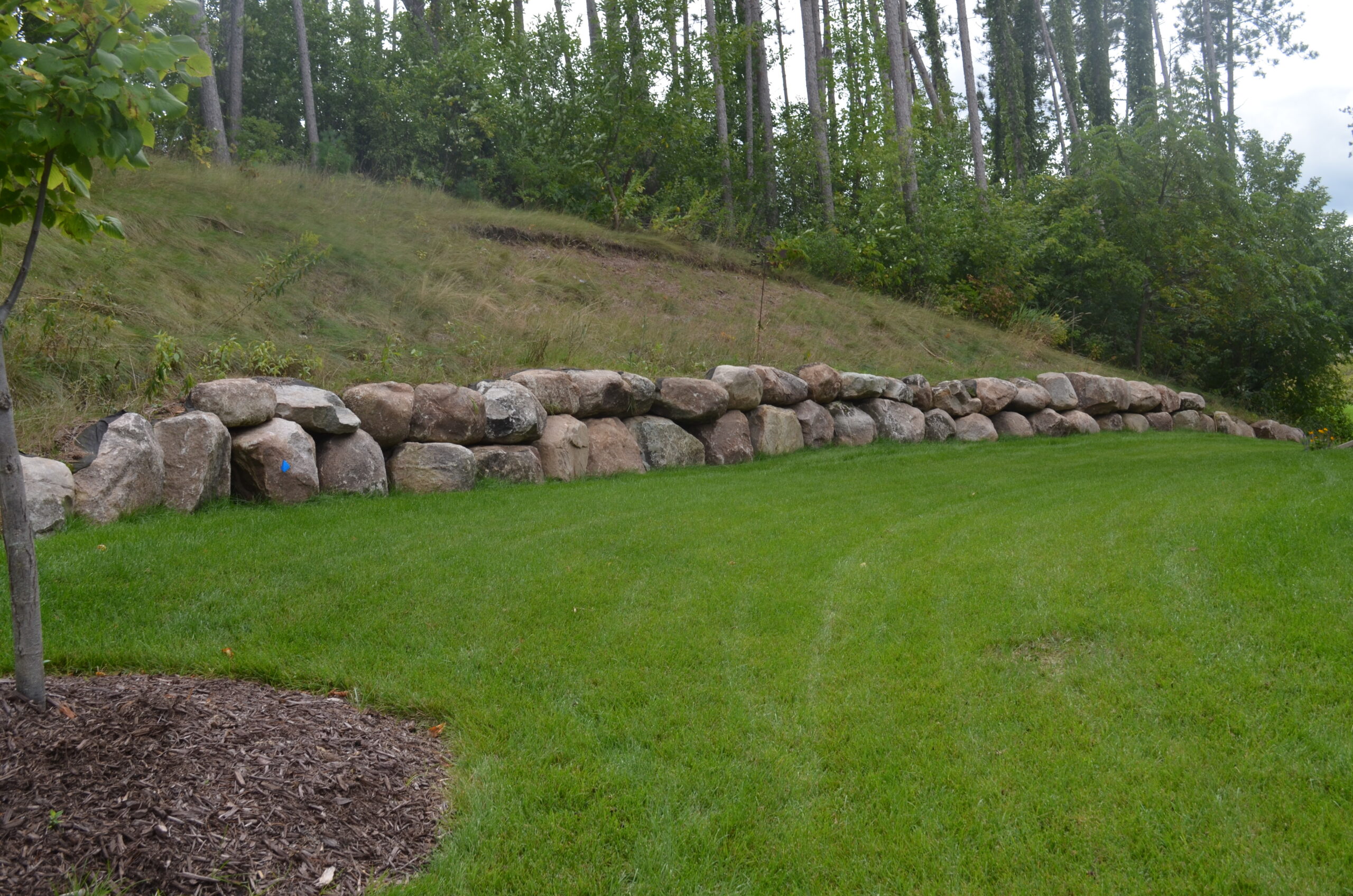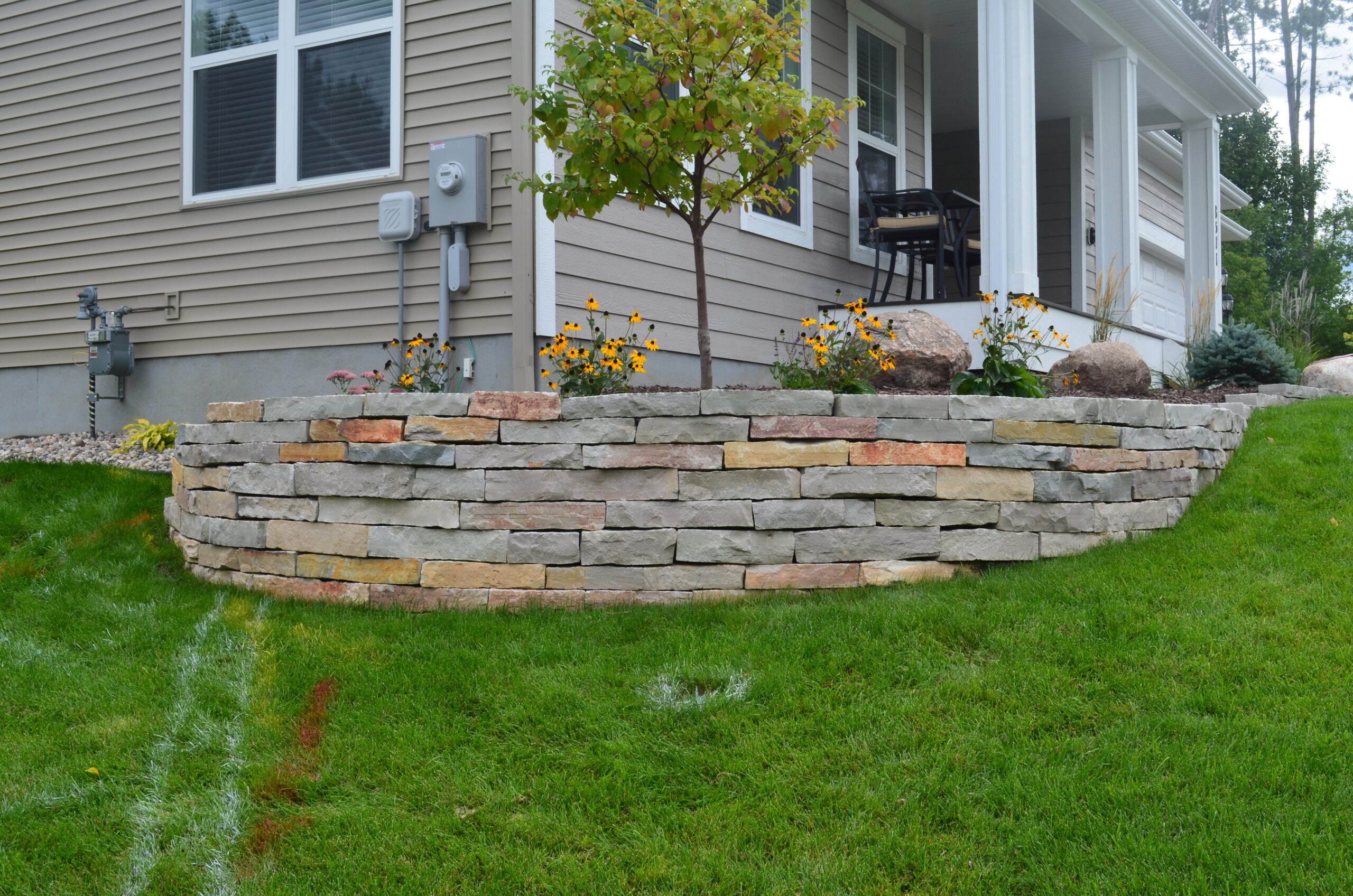 Materials: Stone retaining wall – Chilton weathered edge natural stone. River Rock Boulders. Mulch -Custom brown. Perennials & Shrubs – Globe Blue Spruce, Boxwoods, Euonymus, Grasses (multiple varieties), Hostas, Rudbeckias, Salvia & Sedum. The tree is a Pagoda Dogwood tree.