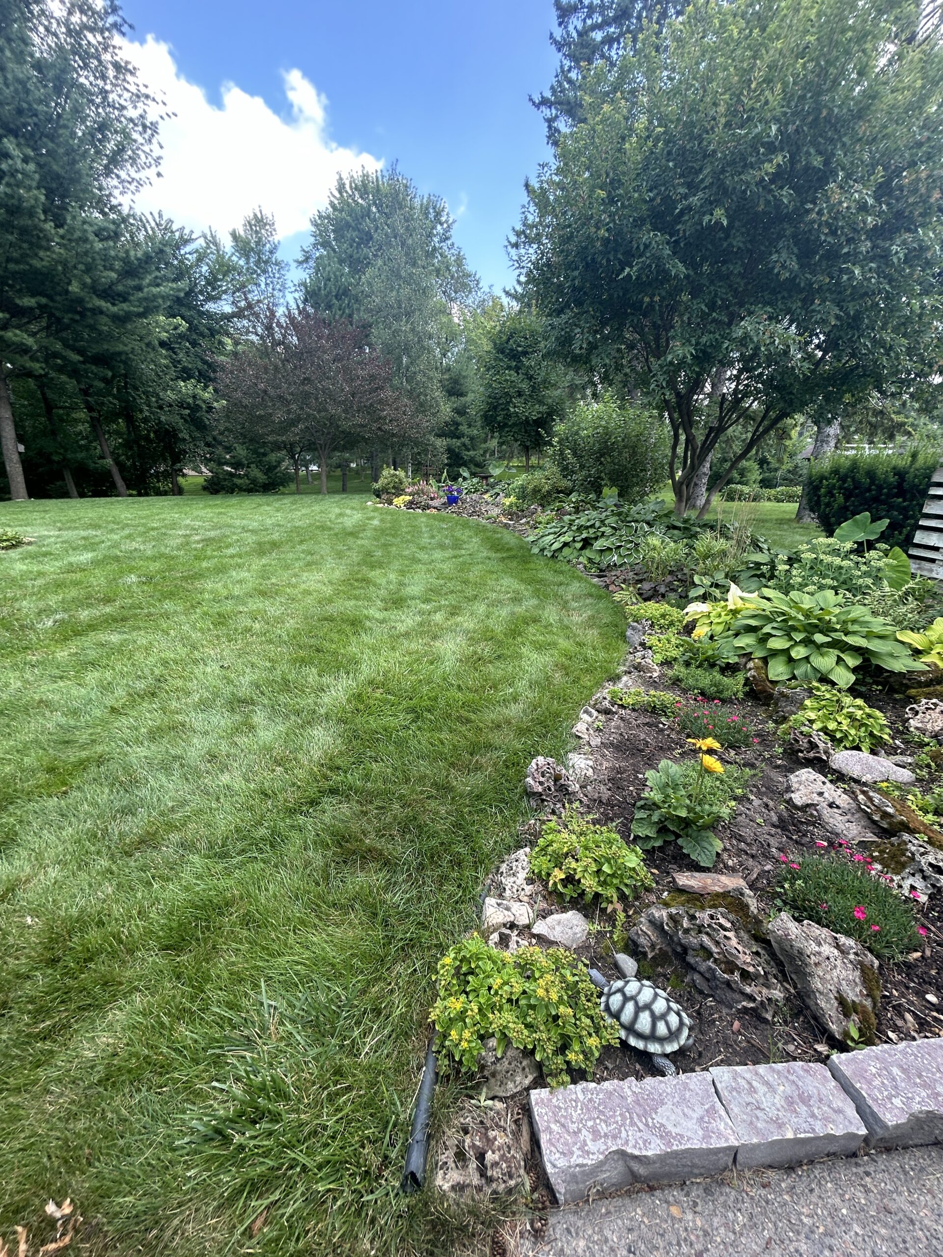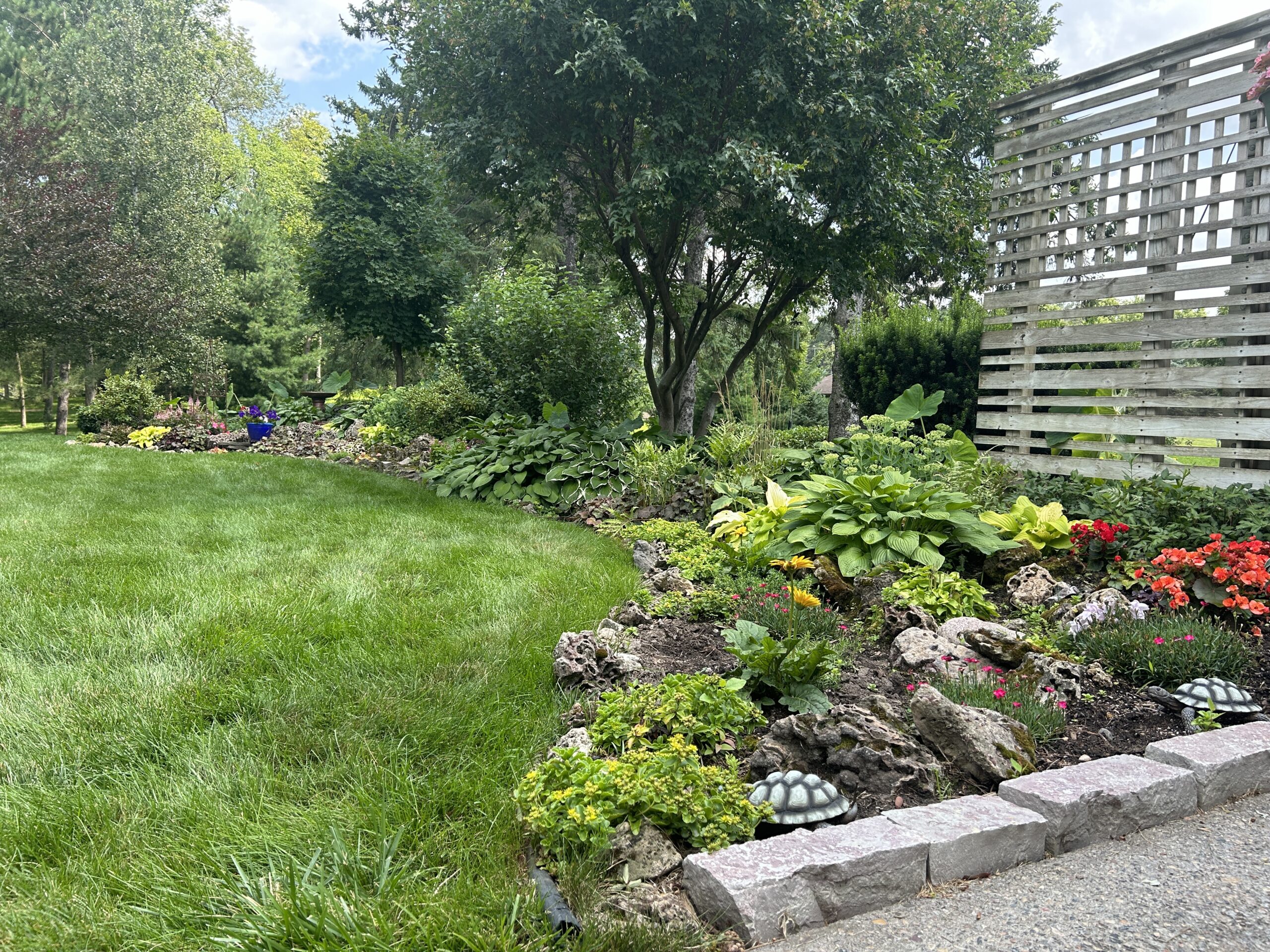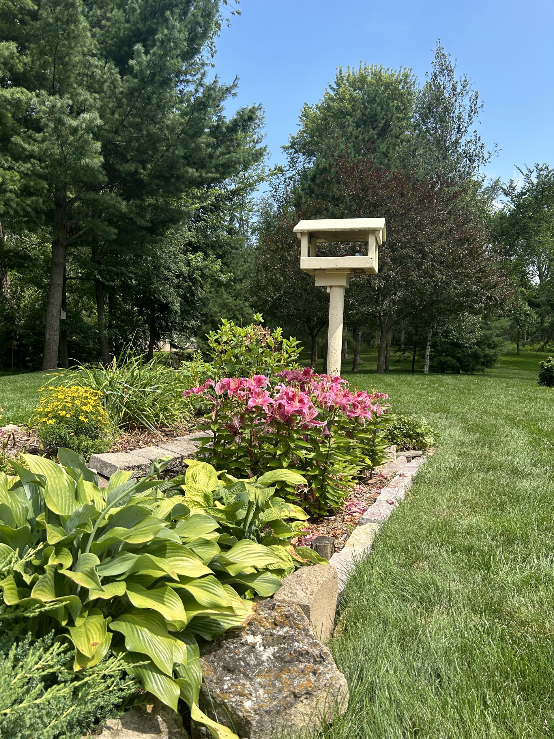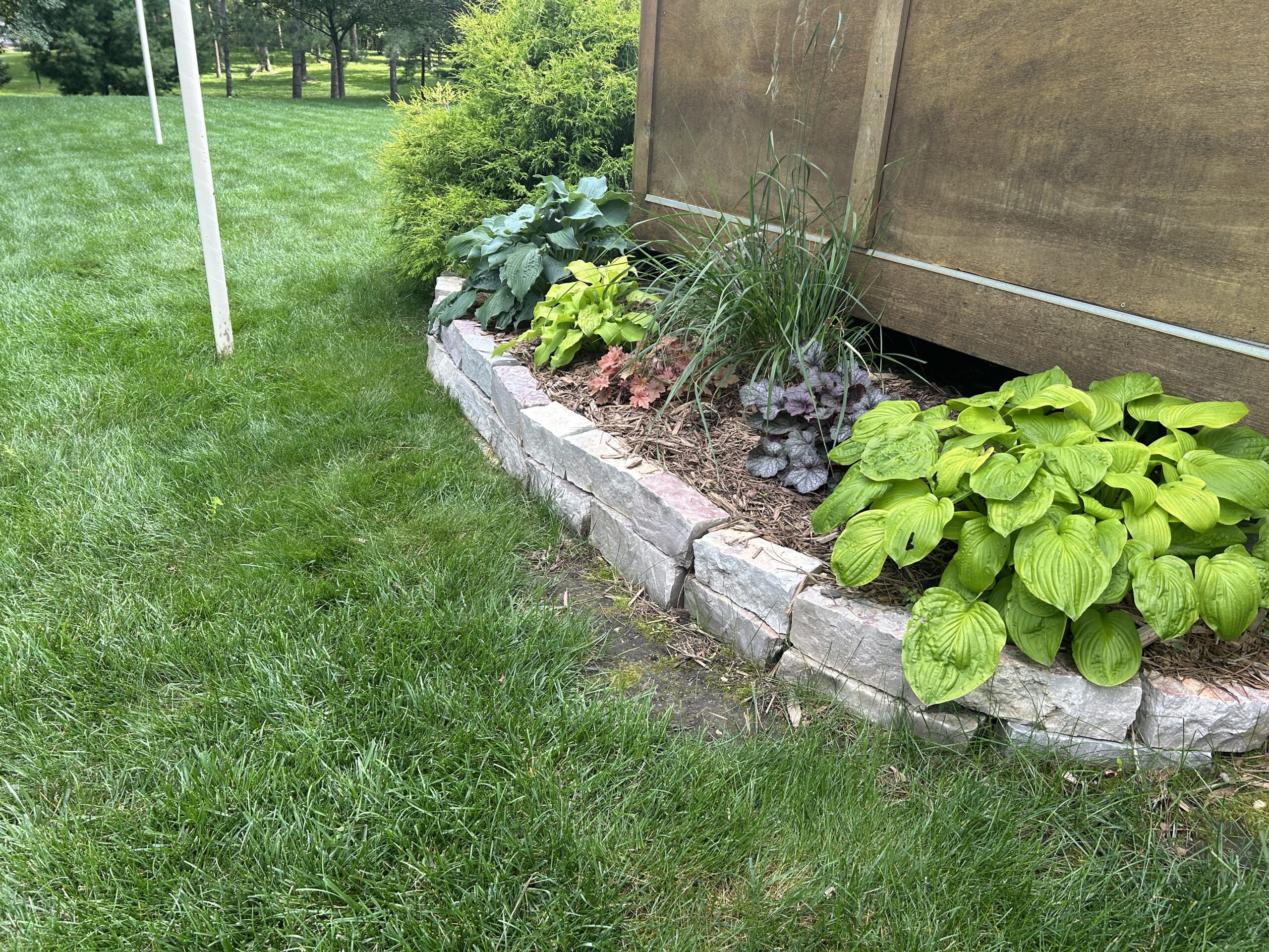 Materials: Borders of landscape beds – Chilton natural wall stone. Plant material list – Arborvitaes, Coreopsis, Dianthus, Ferns, Heucheras, Hostas, Hydrangeas, Juniper, Lilacs, Liliums, Sedums, Spirea, Weigela, various grasses & more.