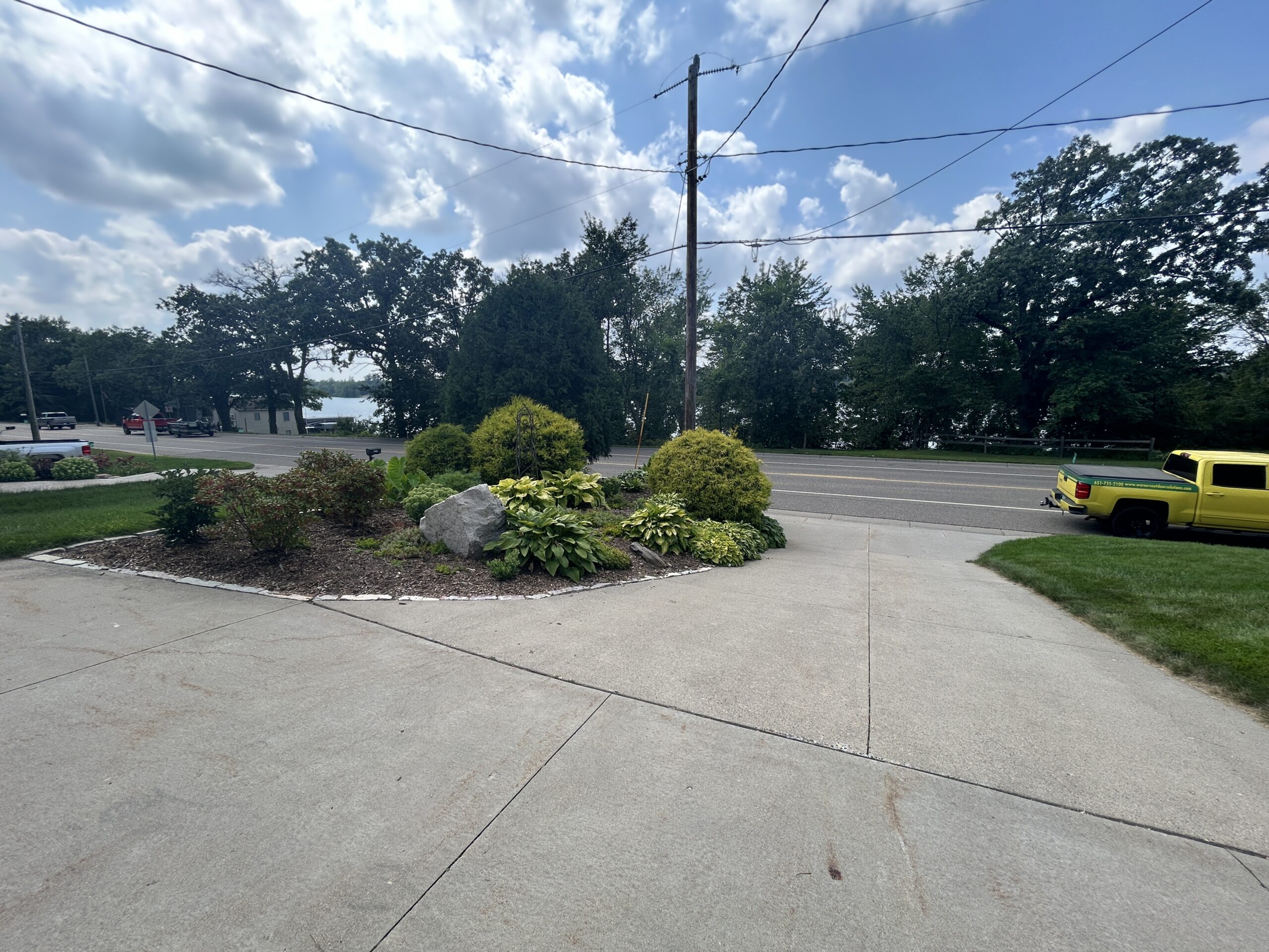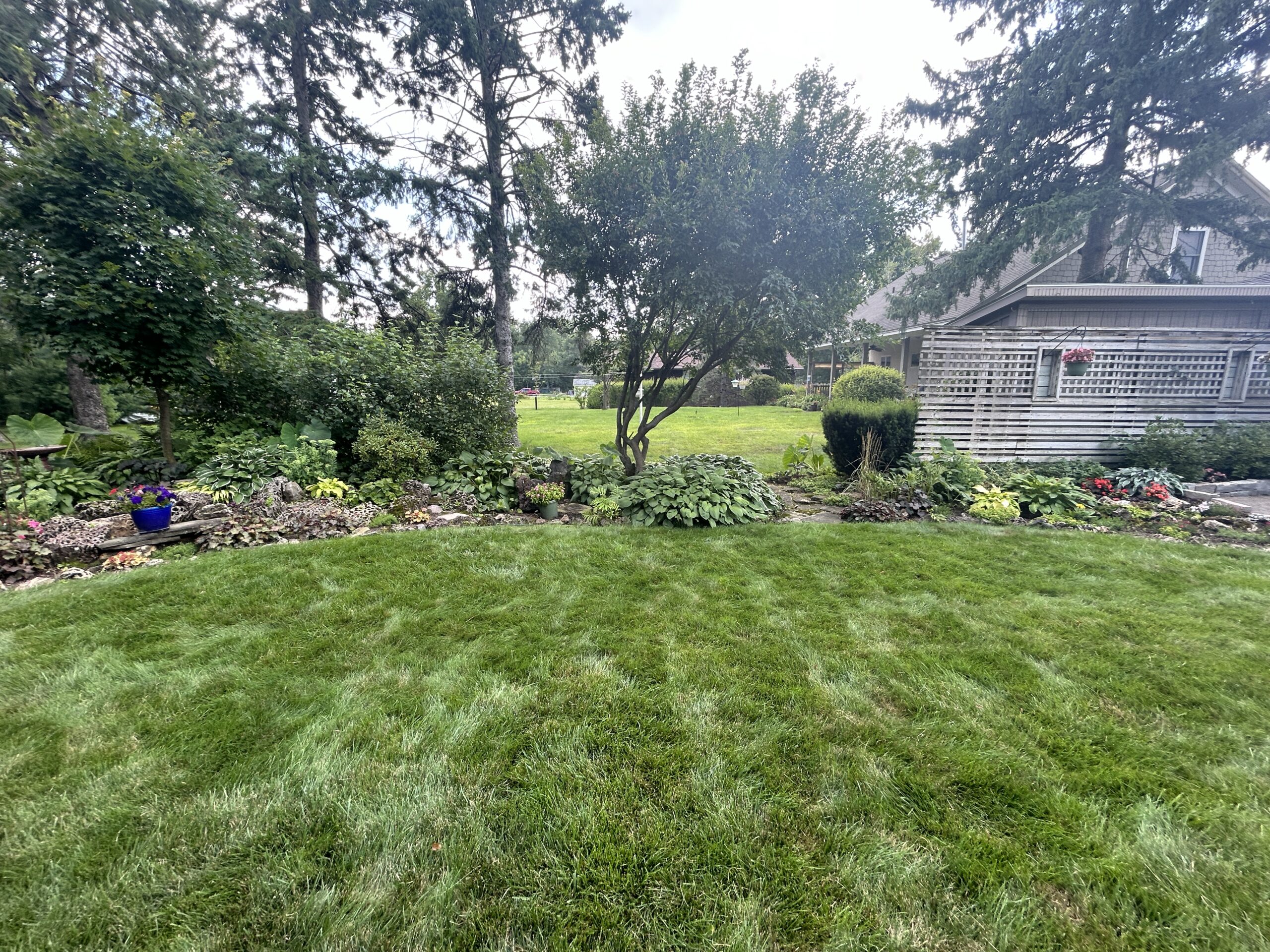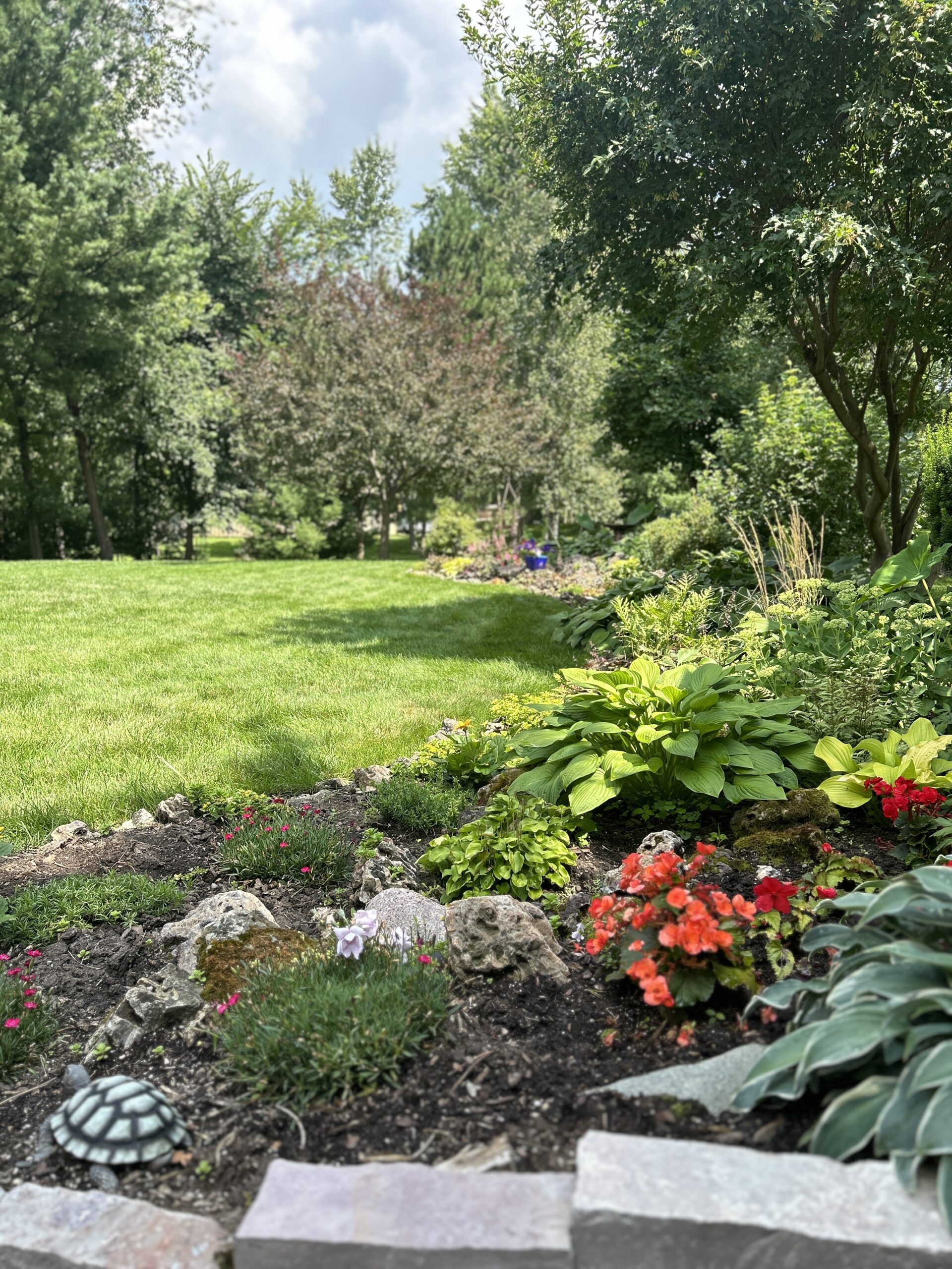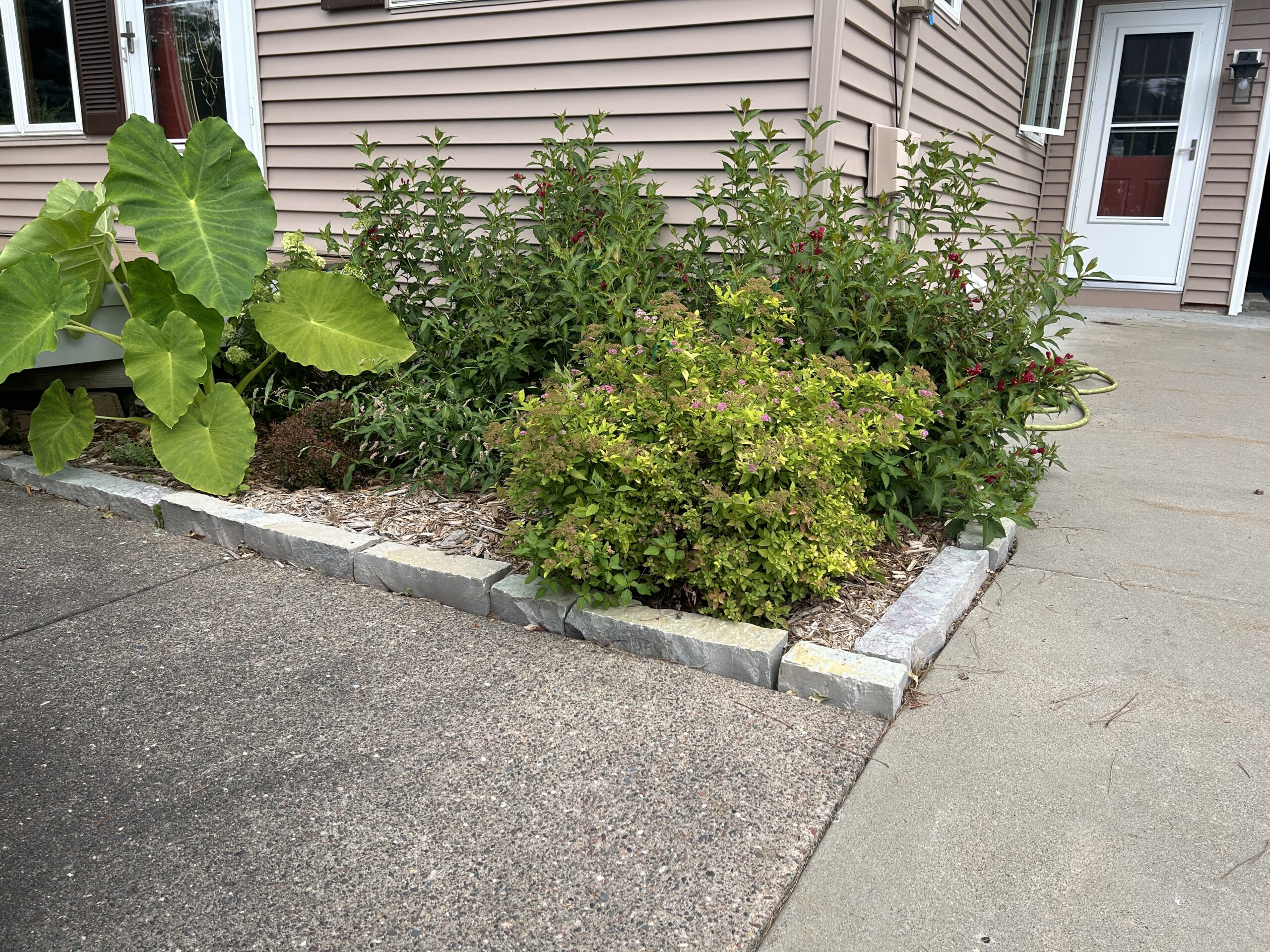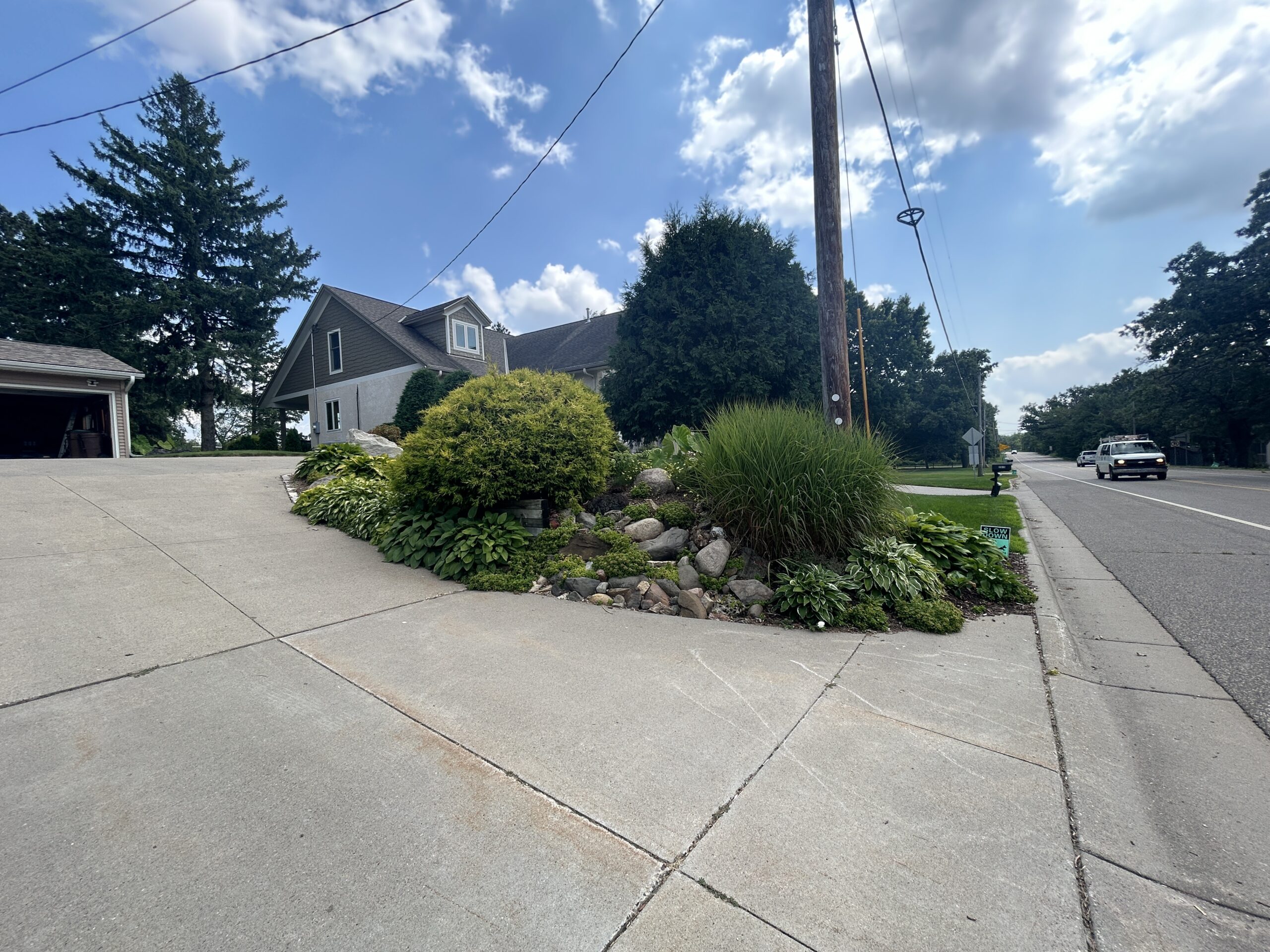 Materials: Borders of landscape beds – Chilton natural wall stone. Plant material list – Arborvitaes, Coreopsis, Dianthus, Ferns, Heucheras, Hostas, Hydrangeas, Juniper, Lilacs, Liliums, Sedums, Spirea, Weigela, various grasses & more.