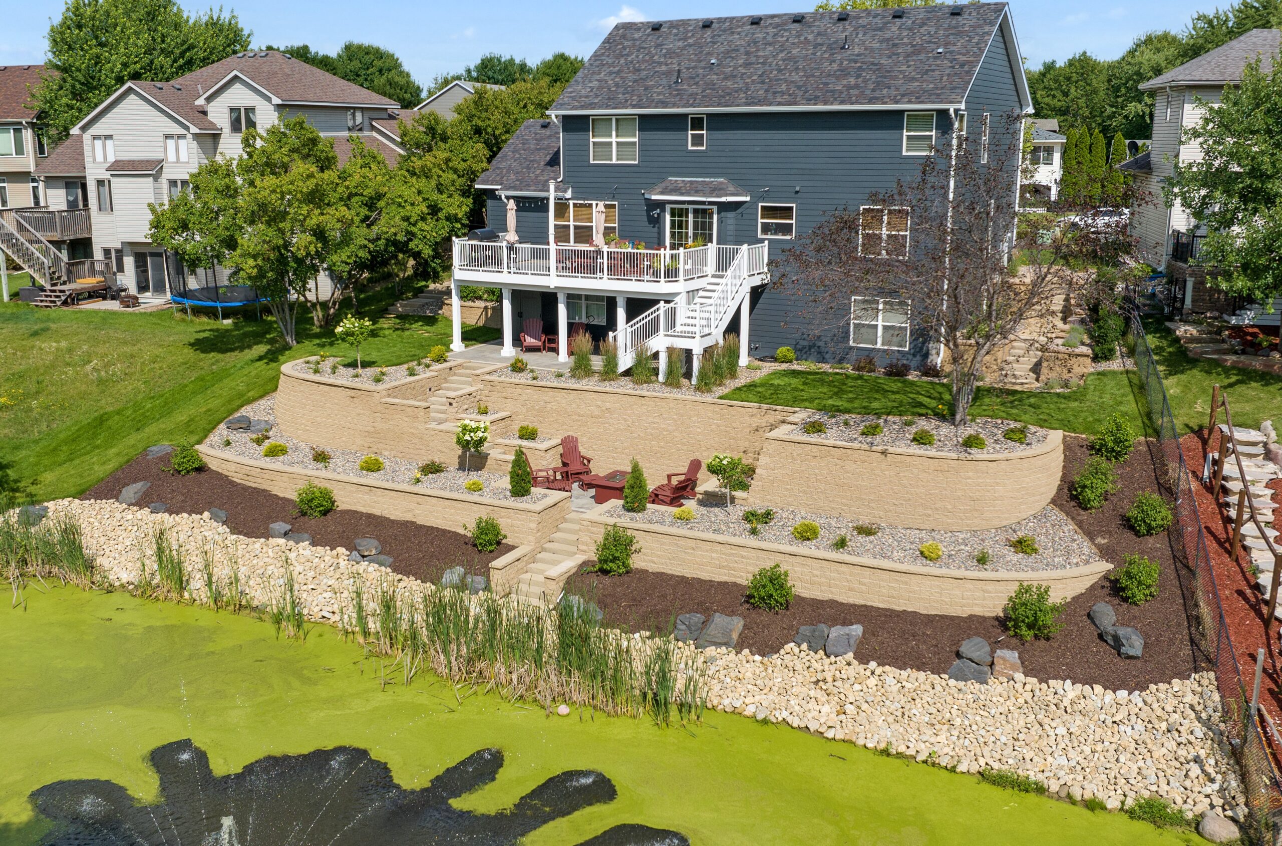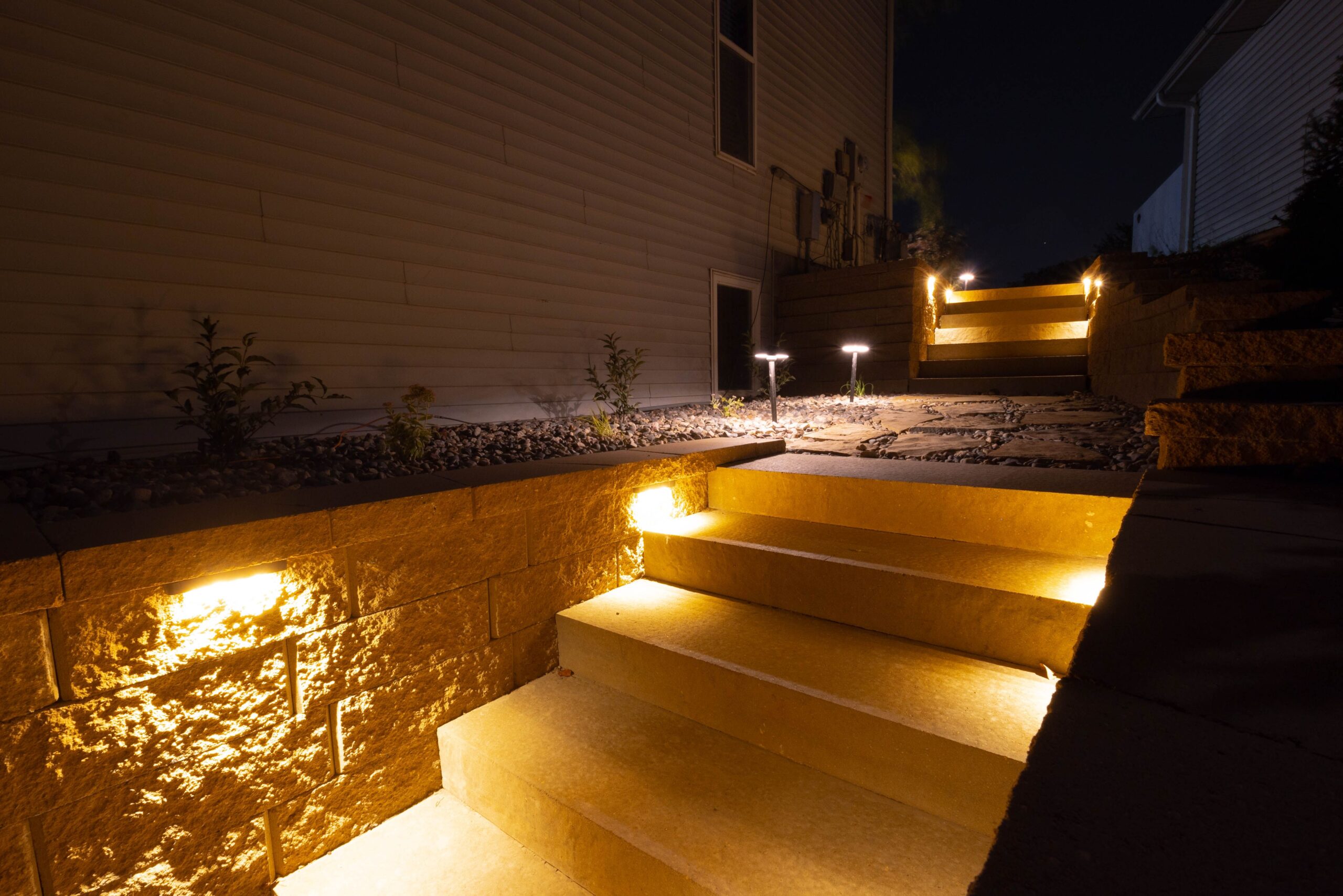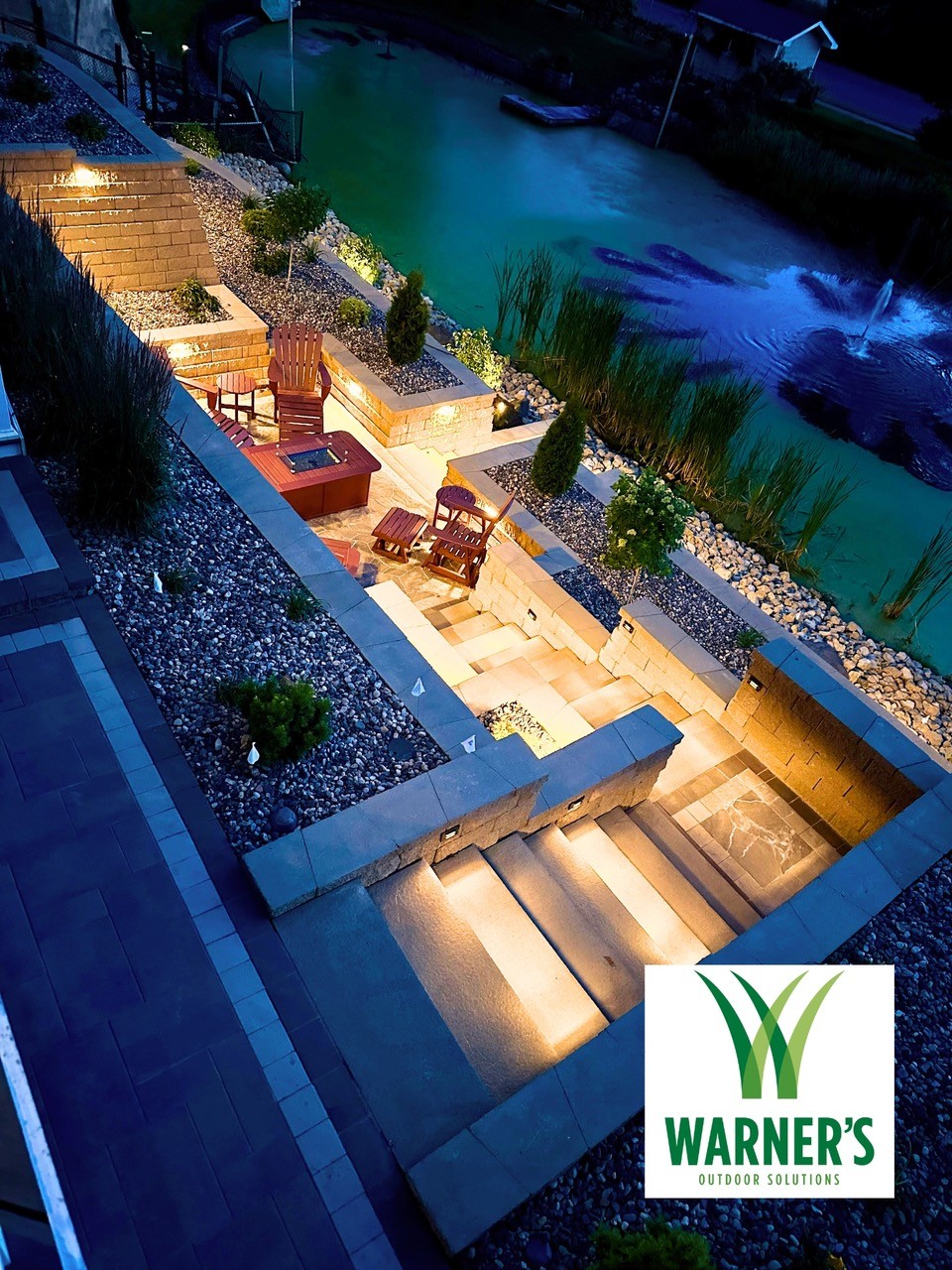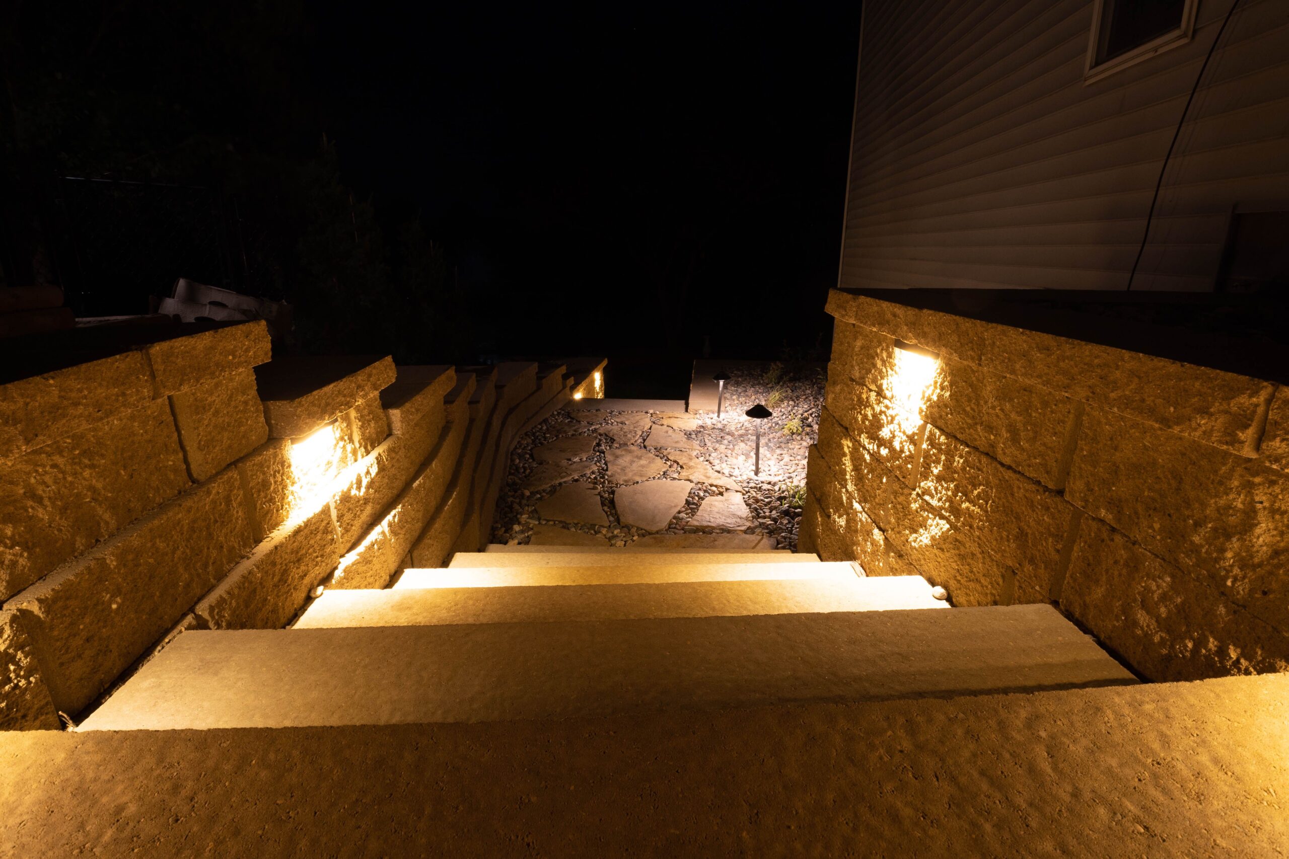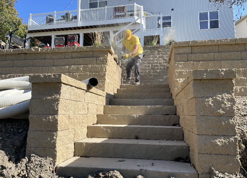 Project: A loyal customer of ours came to us with a large project. A large project, we delivered. Our landscape team removed the old retaining walls. We installed retaining walls on both sides of the home with steps leading to the backyard. The retaining walls have landscape lighting built into the caps with path lights on the landing areas. Next, we installed a paver patio off the basement walkout door. The paver patio leads to steps through the tiered retaining wall down to a paver patio with a firepit. The landscape lighting installed in the retaining walls makes for safe walking to the firepit at night and mood lighting while enjoying a fire. Lastly, another set of steps leads steps lead through another retaining wall down to the pond. This is one of our largest projects to date.