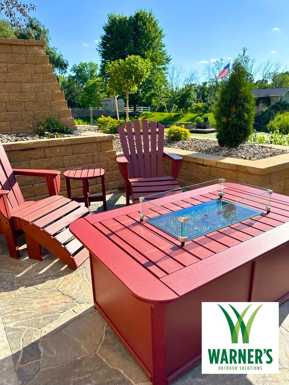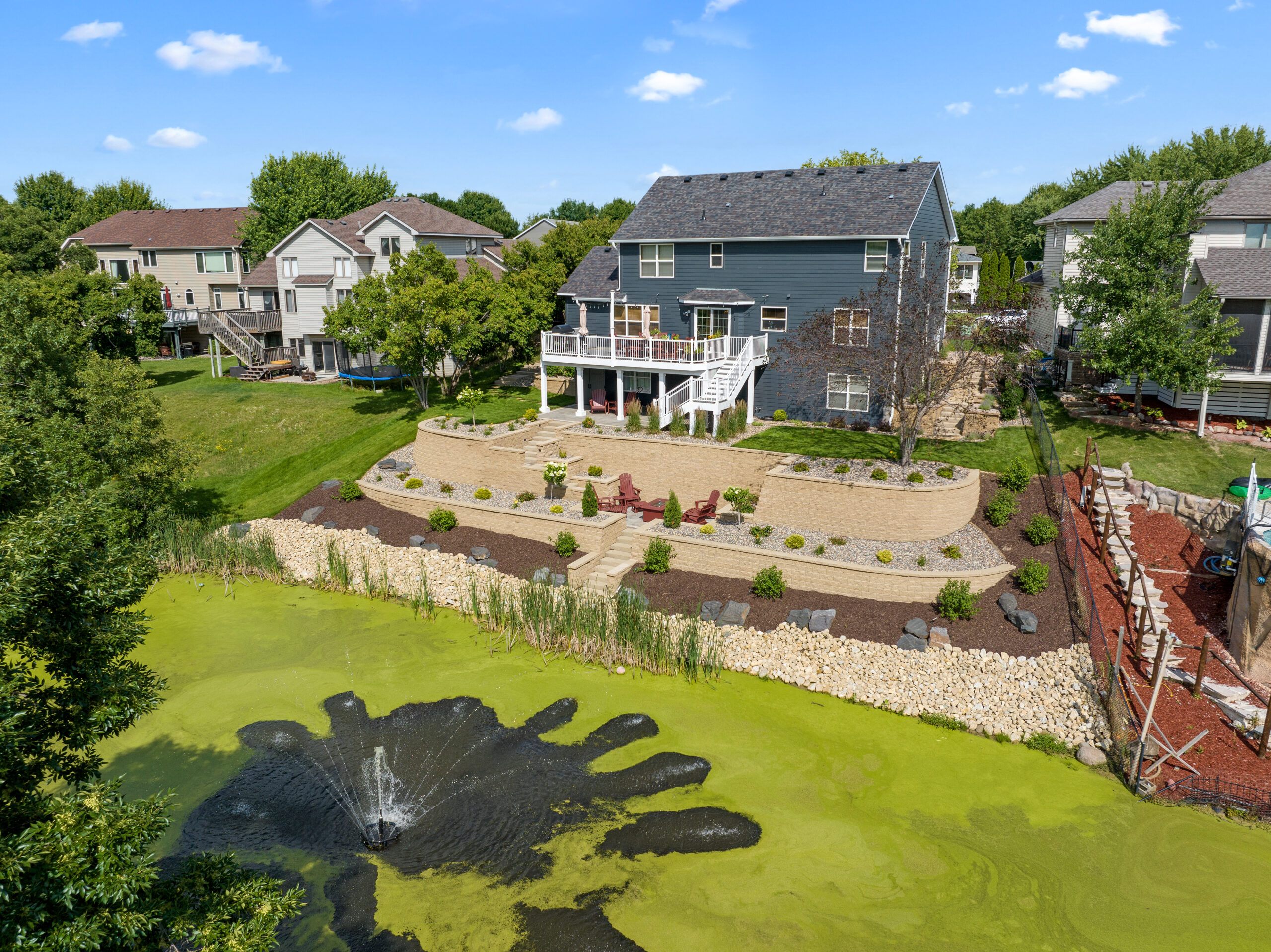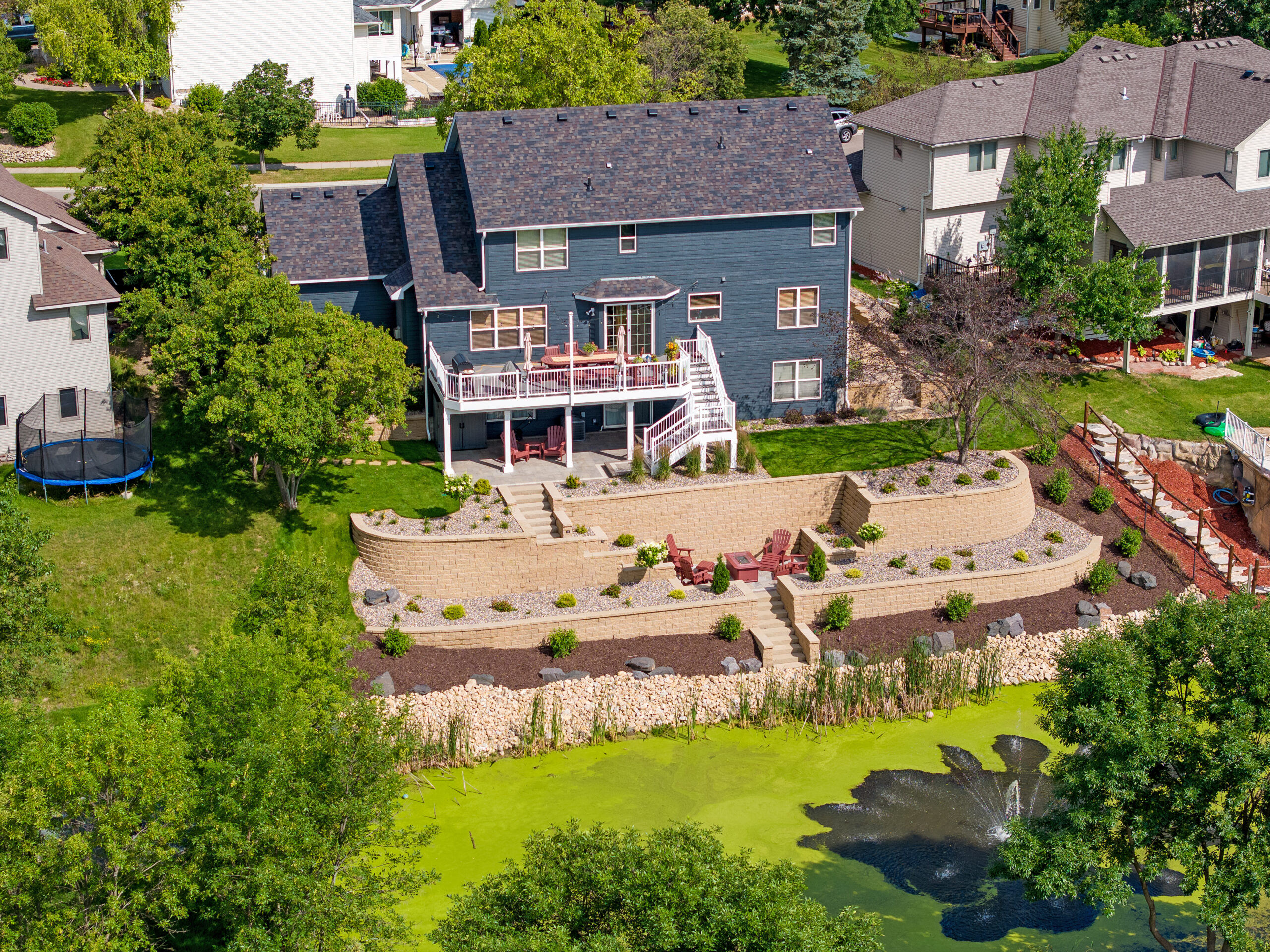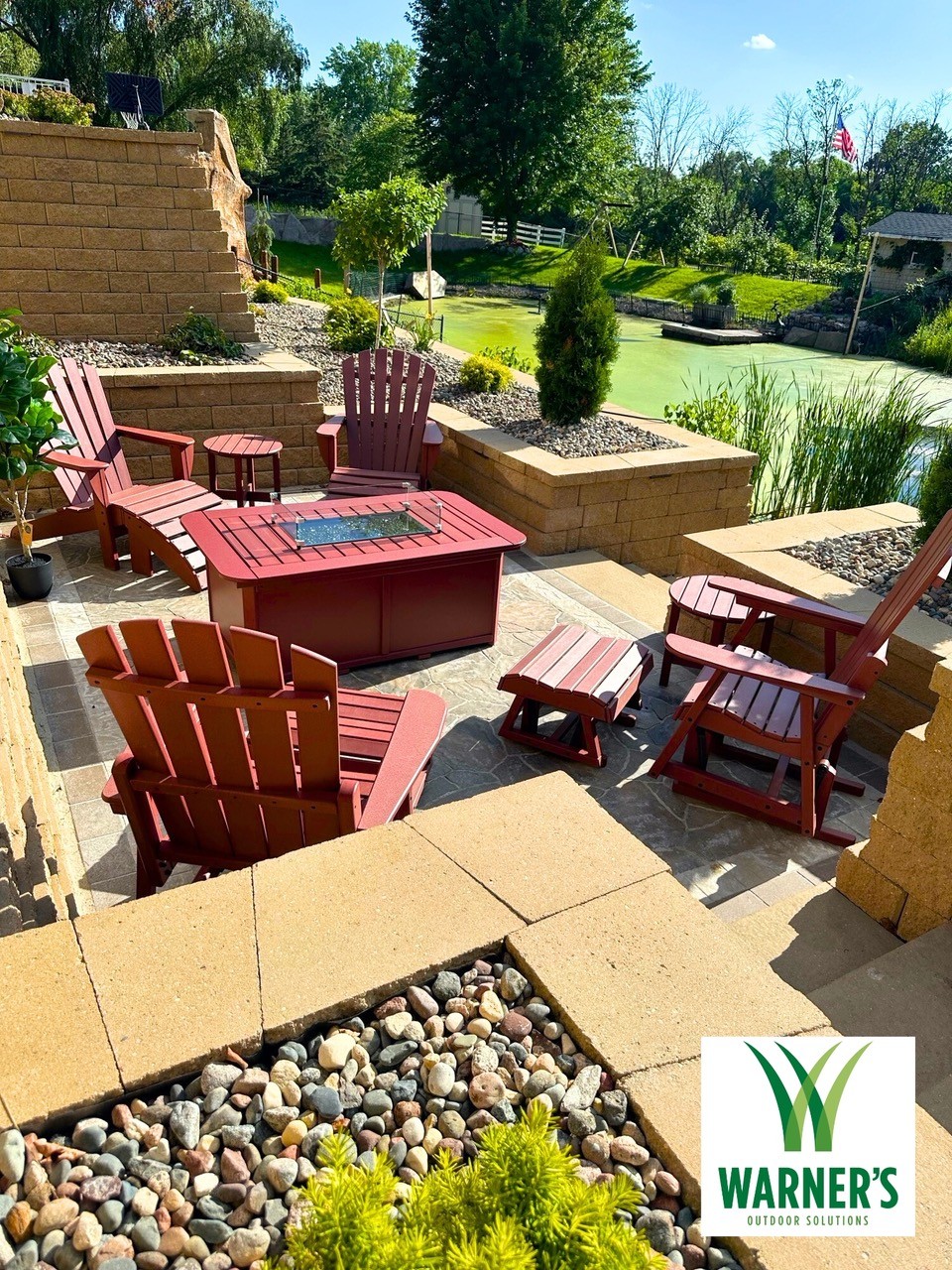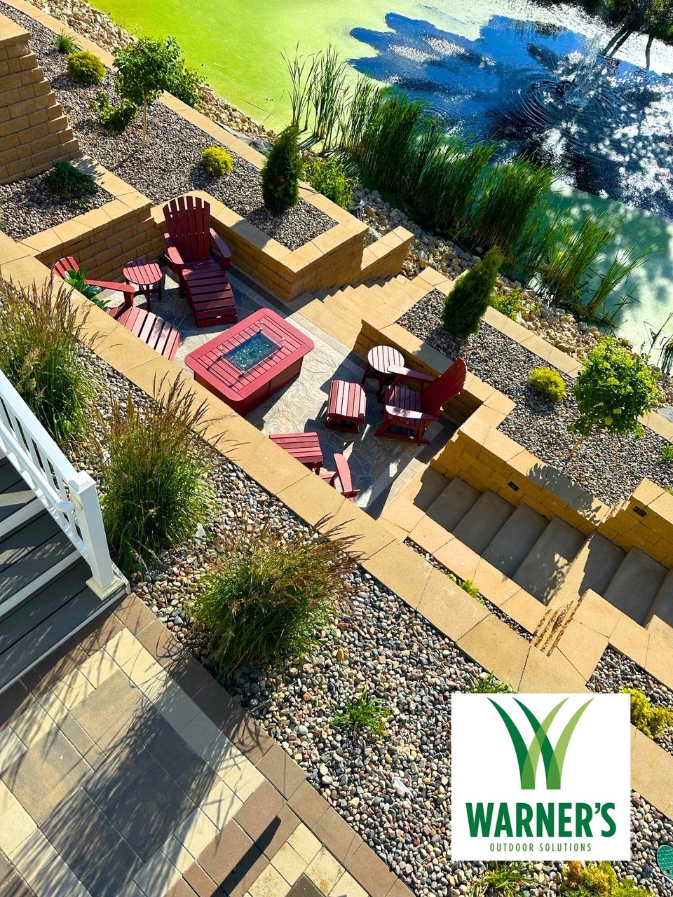 Project: A loyal customer of ours came to us with a large project. A large project, we delivered. Our landscape team removed the old retaining walls. We installed retaining walls on both sides of the home with steps leading to the backyard. The retaining walls have landscape lighting built into the caps with path lights on the landing areas. Next, we installed a paver patio off the basement walkout door. The paver patio leads to steps through the tiered retaining wall down to a paver patio with a firepit. The landscape lighting installed in the retaining walls makes for safe walking to the firepit at night and mood lighting while enjoying a fire. Lastly, another set of steps leads steps lead through another retaining wall down to the pond. This is one of our largest projects to date.