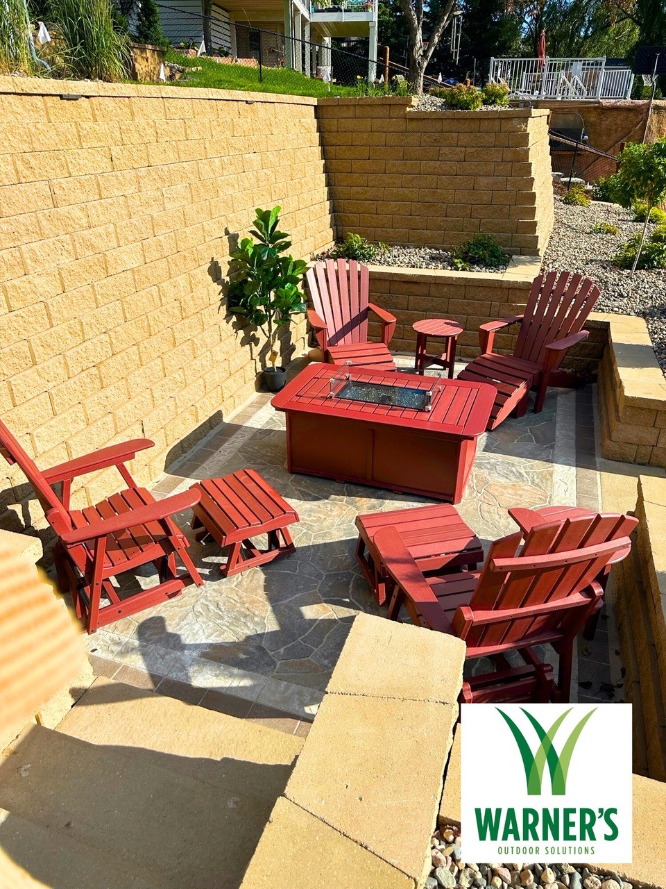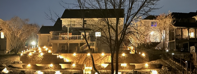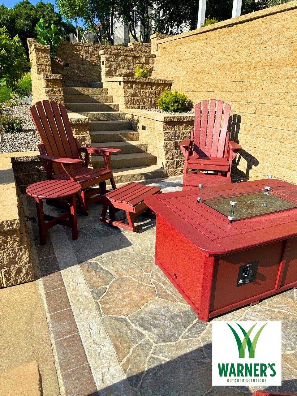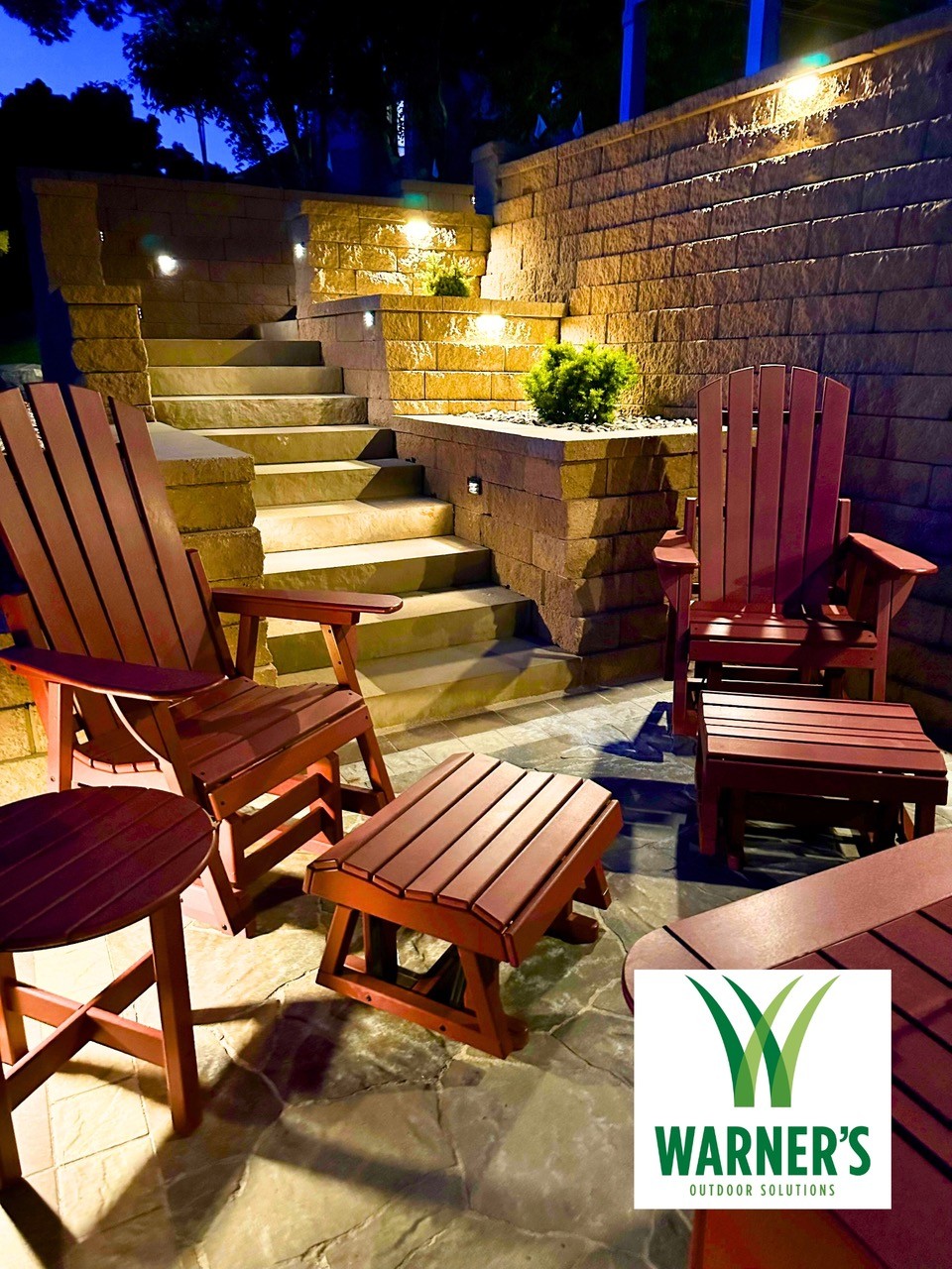 Retaining walls & caps – Belgard, Diamond Strait, Tan. Steps – Belgard, Landing steps, Tan. Paver patio off walkout – Belgard, Dimensions 12, Cotswold mist with paver border, Belgard, Dimensions Accent, Moonlight inside, Russet Outside. Paver patio with firepit – Belgard, Mega Arbel, Cotswold Mist with Origins, Accent, Moonlight inside, Russett outside. Natural flagstone steppers – Mahogany Stone. Landscape lighting – Kitchler path, under caps (back of retaining wall caps), & flood lights (shining up the bottom of the wall). Landscape beds – 2.5” River Rock & brown mulch. Variety of perennials and shrubs.