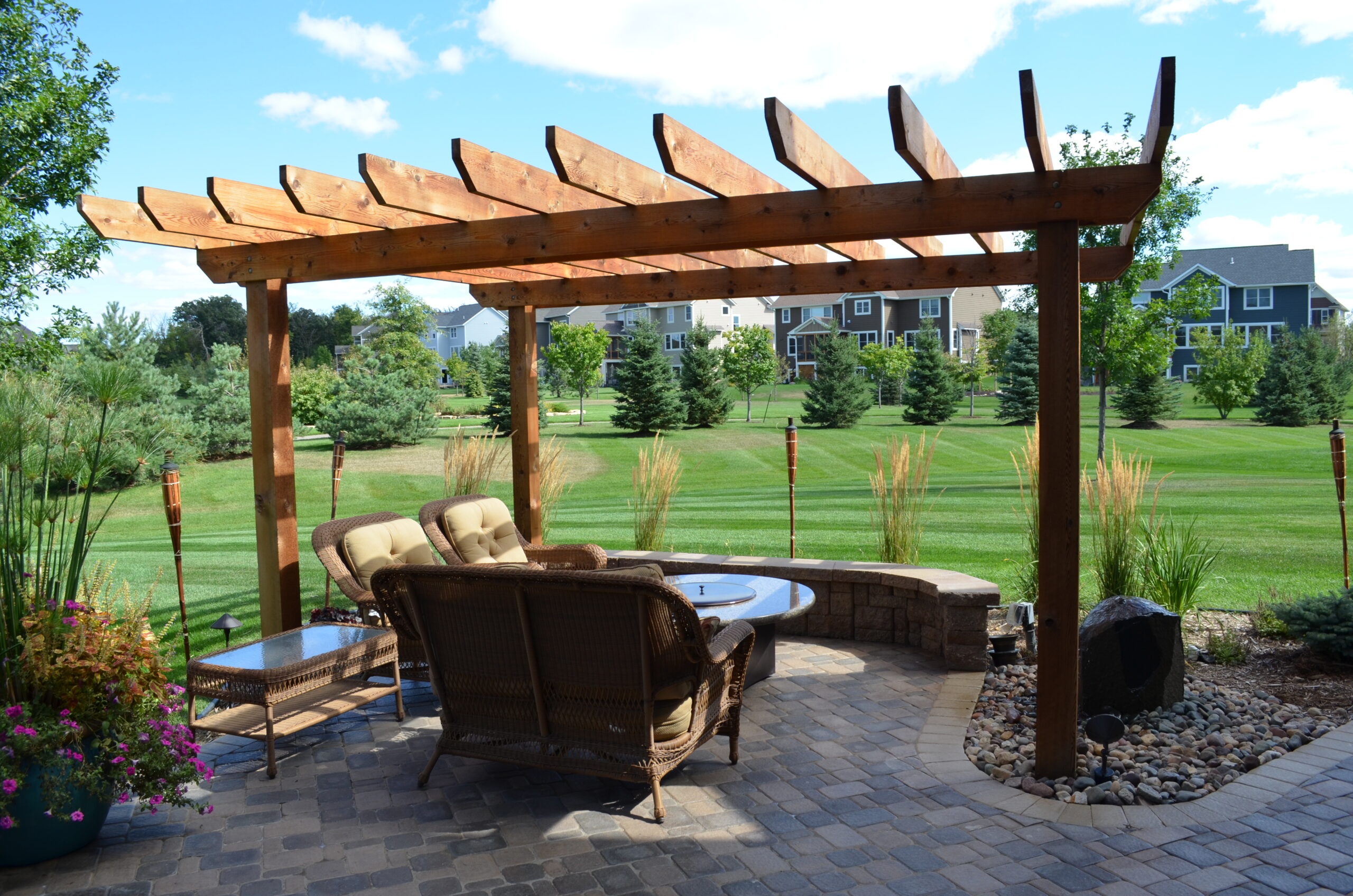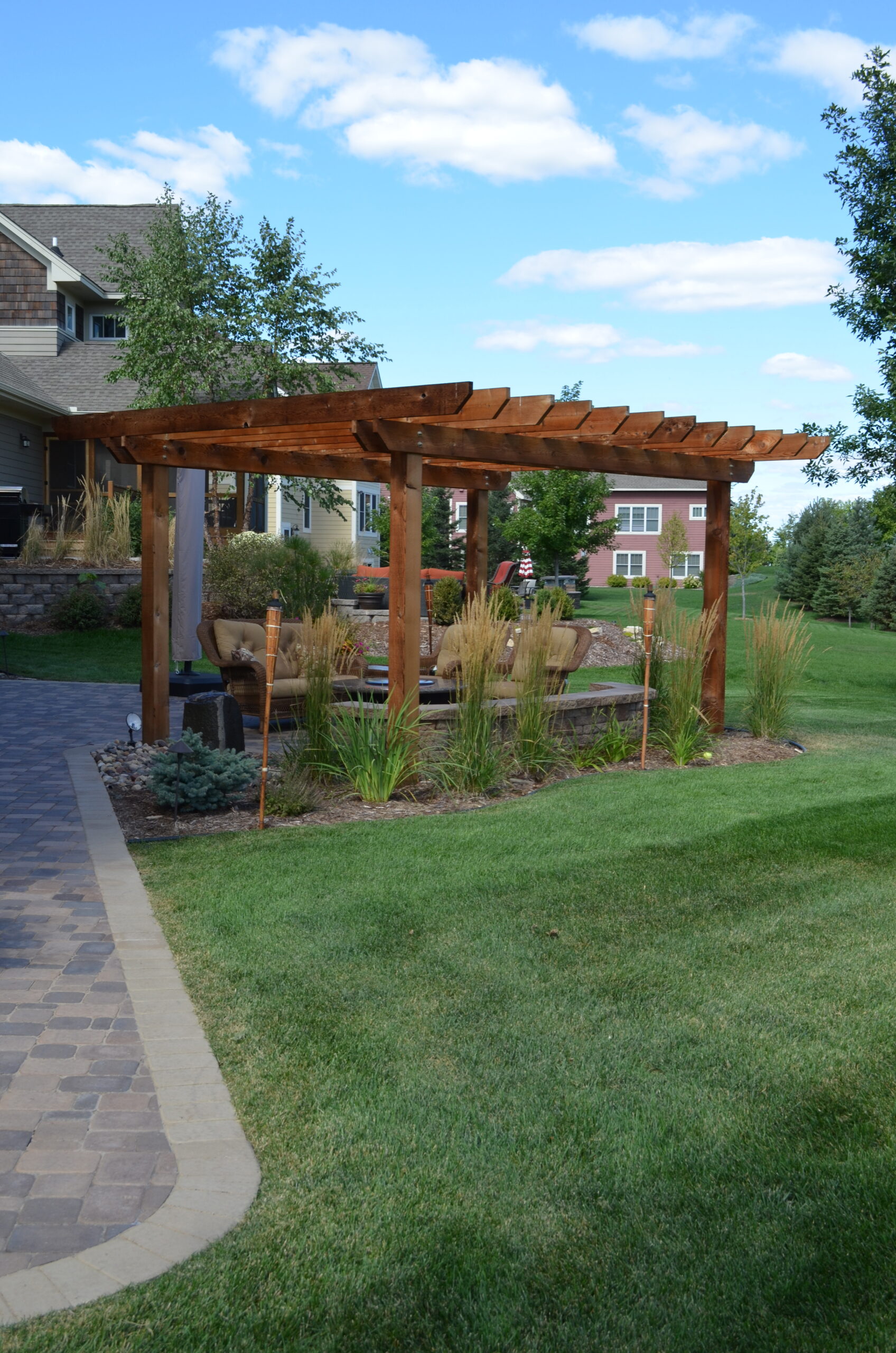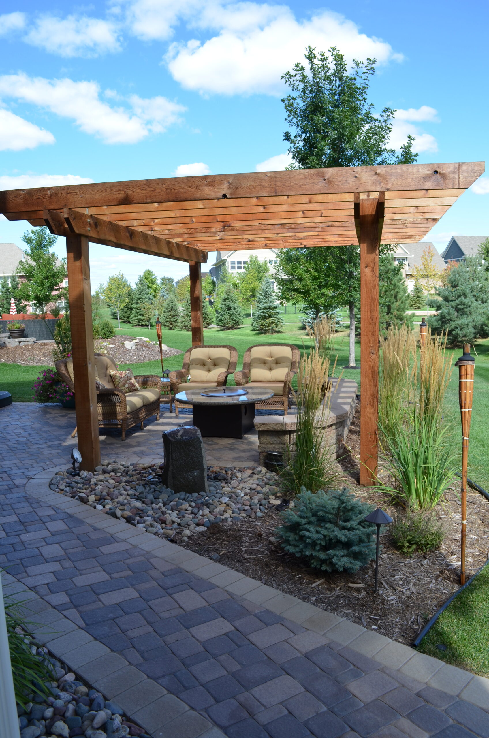Project Overview: Jodee is a long-time customer of ours. When it came time for her to upgrade her landscaping in her backyard. She came to us, again. Our landscapers installed a paver walkway & patio with a knee wall to add seating around the firepit. The custom pergola adds a nice shady touch to her full sun backyard. A water feature adds ambience to the backyard. Whether it’s used during the day, enjoying the shade, or in the evening, by a fire.