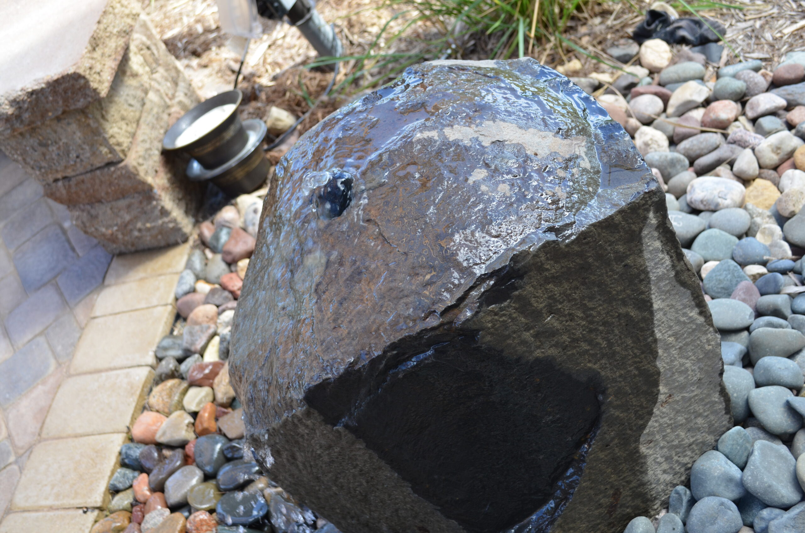 Materials: Pavers – Belgard Kingston Plus 50/50 mix of Barkwood & Woodland. Pavers (Border) – Soldier Course Cambray Tan Large Rec. Pergola – Cedar rough-cut timber for the custom pergola. Retaining wall (knee wall) & caps – Belgard Highland Stone. Landscape Lighting – Kitchler LED’s (path and up lights). Water Feature – Water Bubble rock 3” stone. Rock – River Rock. Mulch – Western Red Cedar.