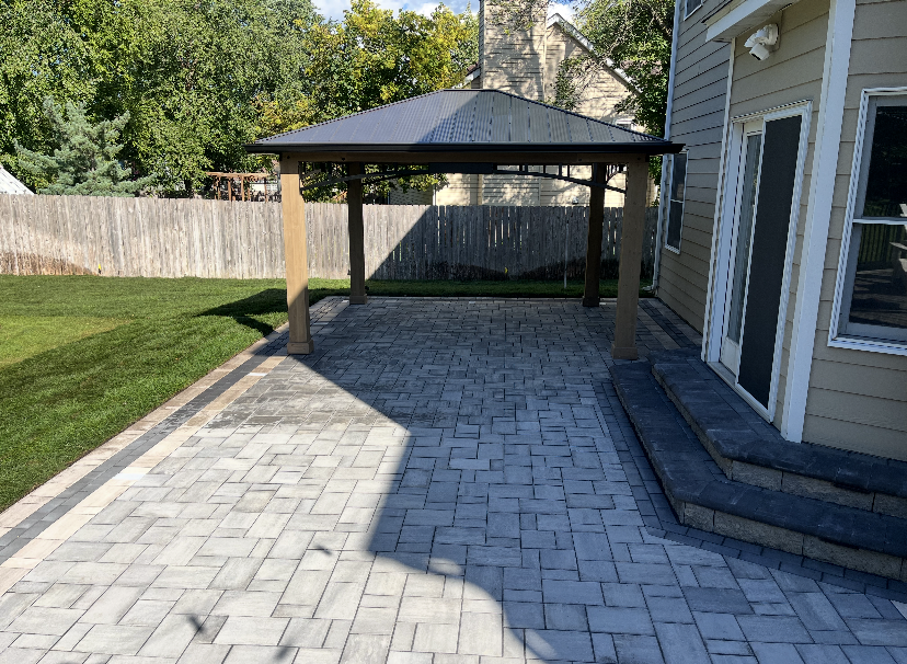 Materials: Discover pavers by County Materials in majestic with a border in tan. Holland paver border stripe in charcoal. Paver lights for landscape lighting. Pergola was purchased by the customer and installed by our landscape crew.